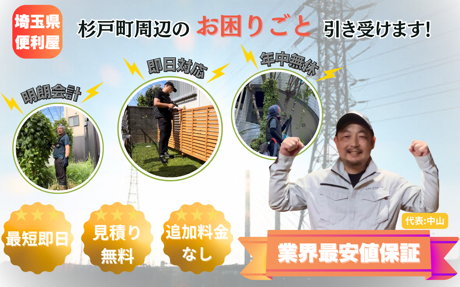 埼玉県北葛飾郡杉戸町を拠点に、春日部市・久喜市・幸手市・白岡市・宮代町など、埼玉東部エリアで地域の皆さまの「ちょっと助けて!」にお応えしています。